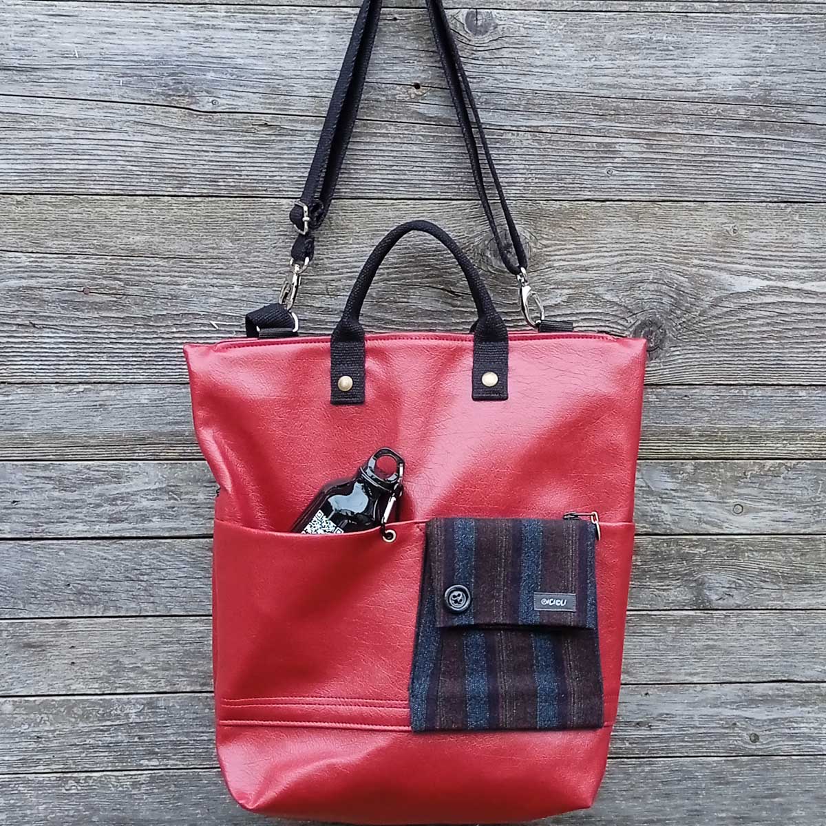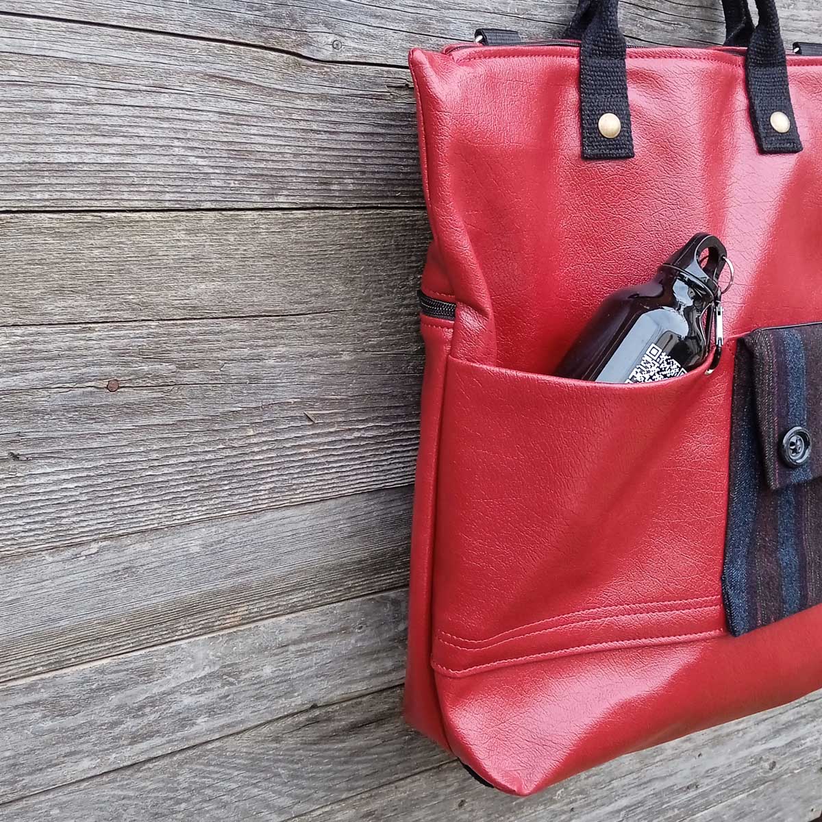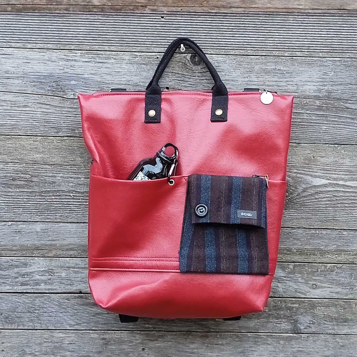 Sul davanti vi è una tasca ricavata da una manica di giacca resa sicura dalla chiusura a zip e altre 2 tasche aperte, in una di queste è inserita una borraccia in alluminio da 400ml che contiene le indicazioni per poter raggiungere la fontana più vicina a te!