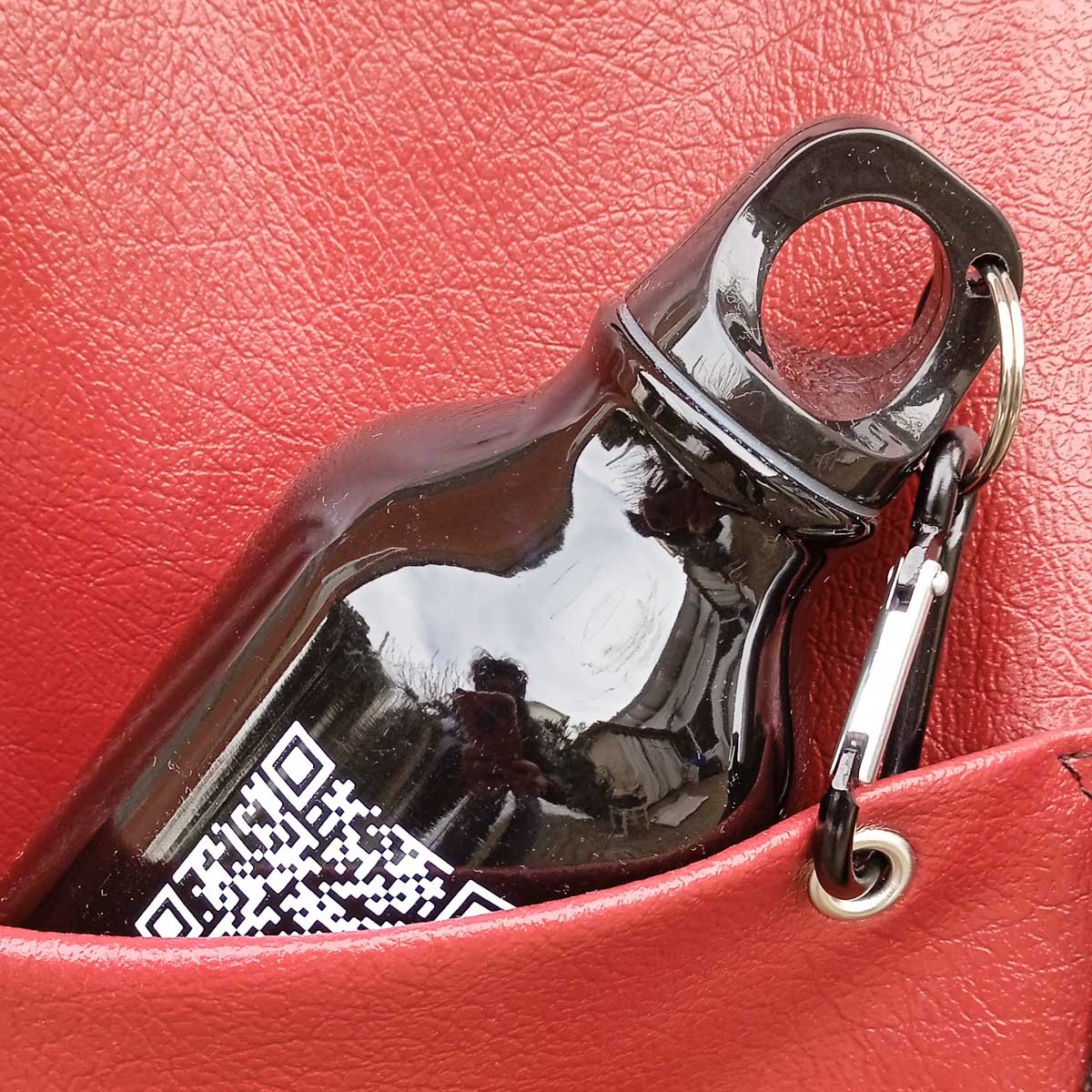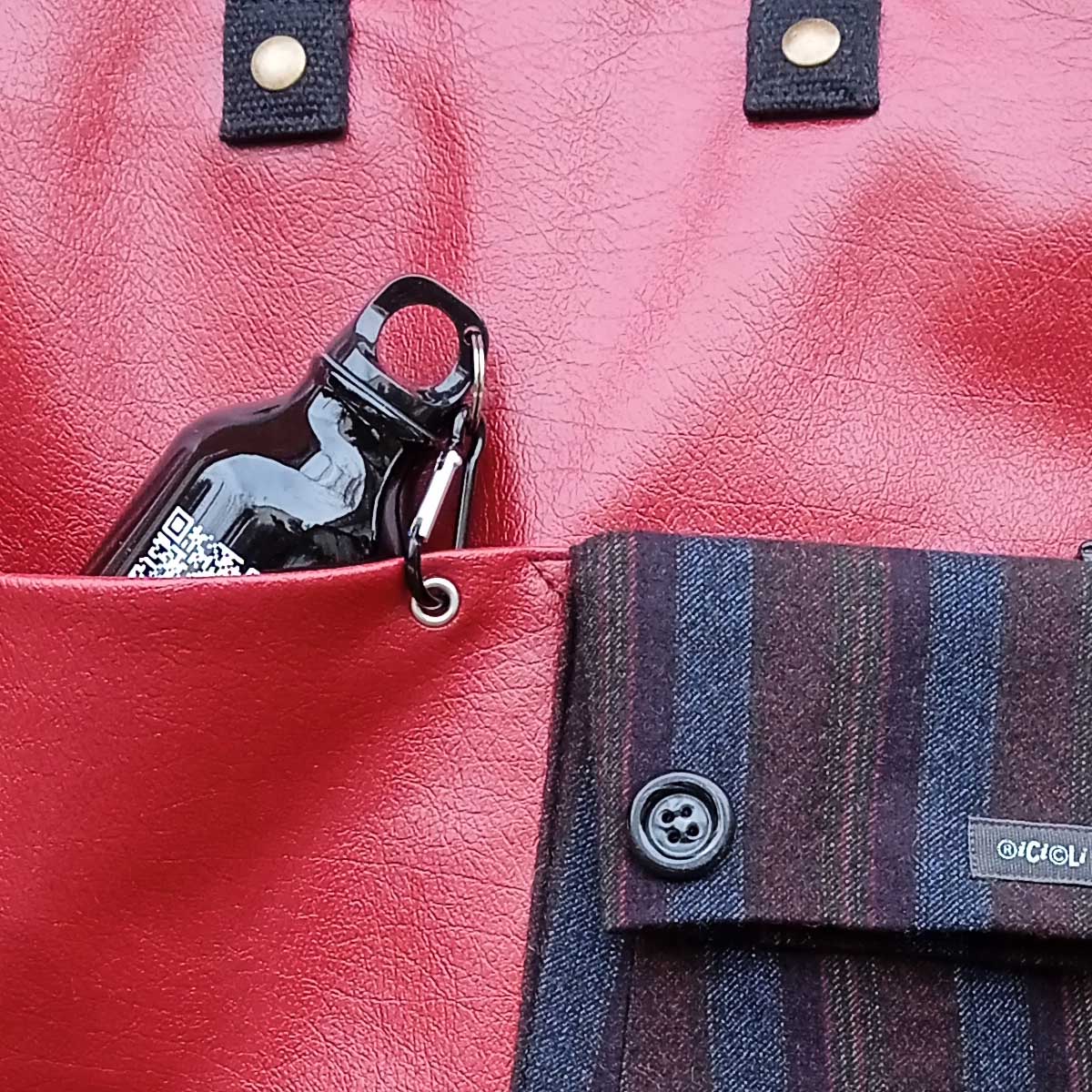 Il moschettone blocca la borraccia ad un occhiello e si può facilmente sganciare. Abbiamo voluto arricchire questa borsa con un valore aggiunto a noi molto caro, suggerendo al cliente di utilizzare l'acqua libera anzichè quella confezionata.