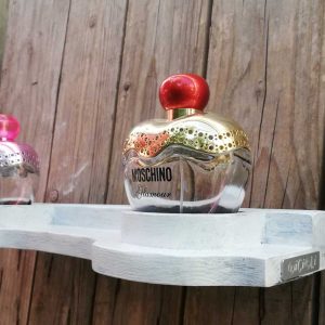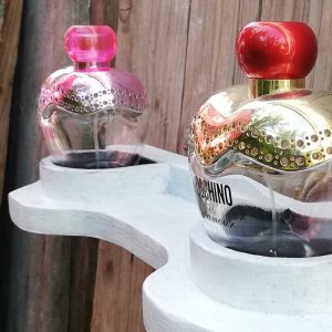 Qui vedete le sue bottiglie di profumo trasformate in attaccapanni per i suoi bagni. Quindi se vi è piaciuto questo recupero, siete invitati/e a non cestinare più i vuoti ma a pensarli come risorse per nuovi progetti che possiamo realizzare per voi!